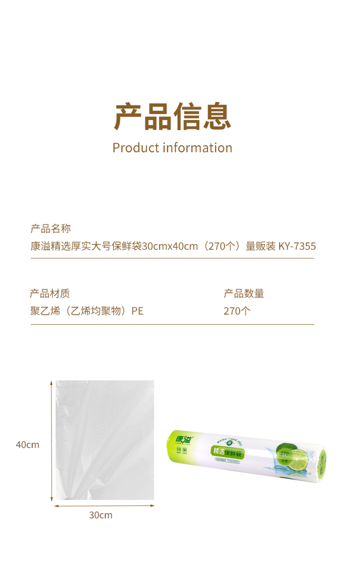 康溢精选厚实大号保鲜袋30cm*40cm(270个)量贩装KY-7355